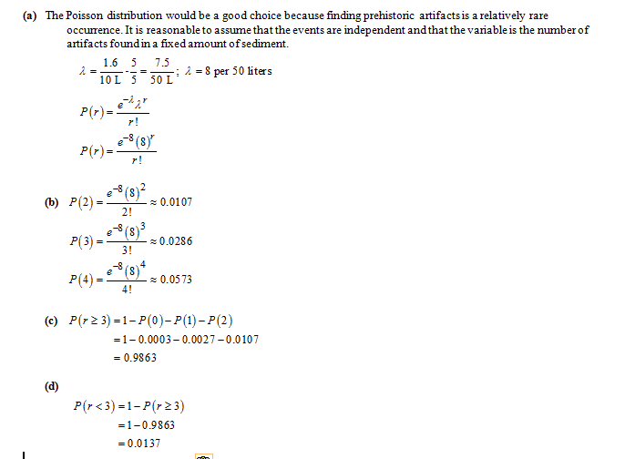 (c) Find the probability that you will find three or more prehistoric artifacts in the 50 liters of sediment. (Use 4 decimal places.)