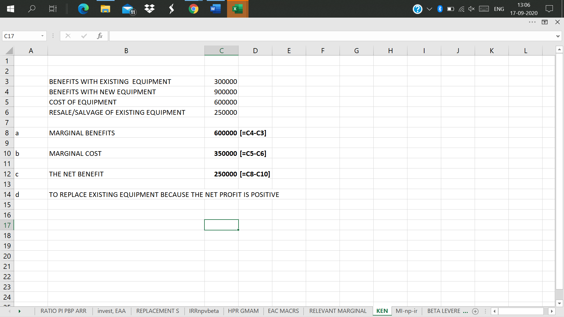 Assume that Monsanto Corporation is considering the replacement of some of its older and outdated carpet-manufacturing equipment. Its objective is to improve the efficiency of operations in terms of both speed and reduction in the number of defects. The company’s finance department has compiled pertinent data that will allow it to conduct a marginal cost–benefit analysis for the proposed equipment replacement. The cash outlay for new equipment would be approximately $600,000. The net book value of the old equipment and its potential net selling price add up to $250,000. The total benefits from the new equipment (measured in today’s dollars) would be $900,000. The benefits of the old equipment over a similar period of time (measured in today’s dollars) would be $300,000