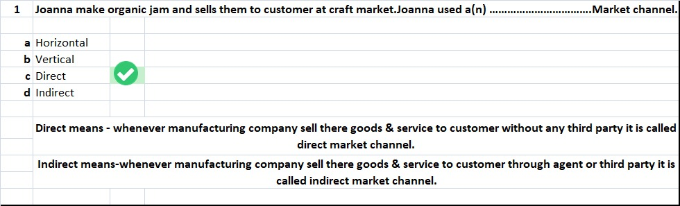 2)Joanna makes organic jams and sells them to customers at local craft markets. Joanna is using a[n). marketing channel Multiple Choice 1:38 horizontal vertical direct Indirect