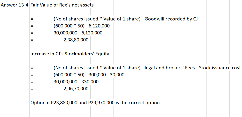 2)Business Combinations 35 13-4: On January 1, 2017, CJ Corporation acquired the net assets of Rex, Inc., by issuing 600,000 shares of its P10 par value common stock. Subsequently, Rex was liquidated and its assets and liabilities merged into CJ Corporation. CJ's stock was selling for P50 per share on January 1, 2017. The amount of goodwill recorded by CJ in connection with the combination was P6,120,000. CJ incurred P300,000 of legal and brokers fees associated with the combination and P30,000 of stock issuance costs. What is the fair value of Rex's net assets and the amount of the increase in CJ's stockholders' equity as a result of the combination, respectively? P23,880,000 and P30,000,000 b. P24,180,000 and P30,000,000 P24,180,000 and P29,970,000 P23,880,000 and P29,970,000 13-5: Pool Company issued 120,000 shares of P10 par common stock with a fair value of P2,550,000 for the net assets of Spot Company. In addition, Pool incurred the following acquisition-related costs: Legal fees to arrange the business combination P25,000 Costs of SEC registration, including accounting and legal fees Cost of issuing stock certificates 3,000 Documentary stamp tax 20,000 c. d. 12,000 Immediately before the business combination in which Spot Company was dissolved, Spot's assets and equities were as follows (in thousands): Book Valne Fair Value Current assets P2,000 P1.100 Plant assets 1,500 2,200 Liabilities 300 300 Common stock 2,000 Retained earnings 200 What is the amount of goodwill income from acquisition) and APIC to be recognized by Pool Company? a. P(450,000) and P1,335,000 b. P(410,000) and P1,200,000 c. P(425,000) and P1,185,000 d. P(450,000) and P1,315,000