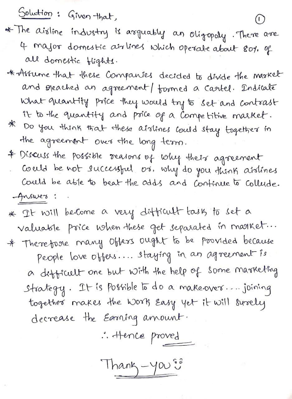 The airline industry is arguably an oligopoly. There are 4 major domestic airlines which operate about 80% of all domestic flights. Assume that these companies decided to divide the market and reached an agreement/formed a cartel. Indicate what quantity and price they would try to set and contrast it to the quantity and price of a competitive market. Do you think that these airlines could stay together in the agreement over the long term? Discuss possible reasons of why their agreement could be not successful or, why do you think airlines could be able to beat the odds and continue to collude?