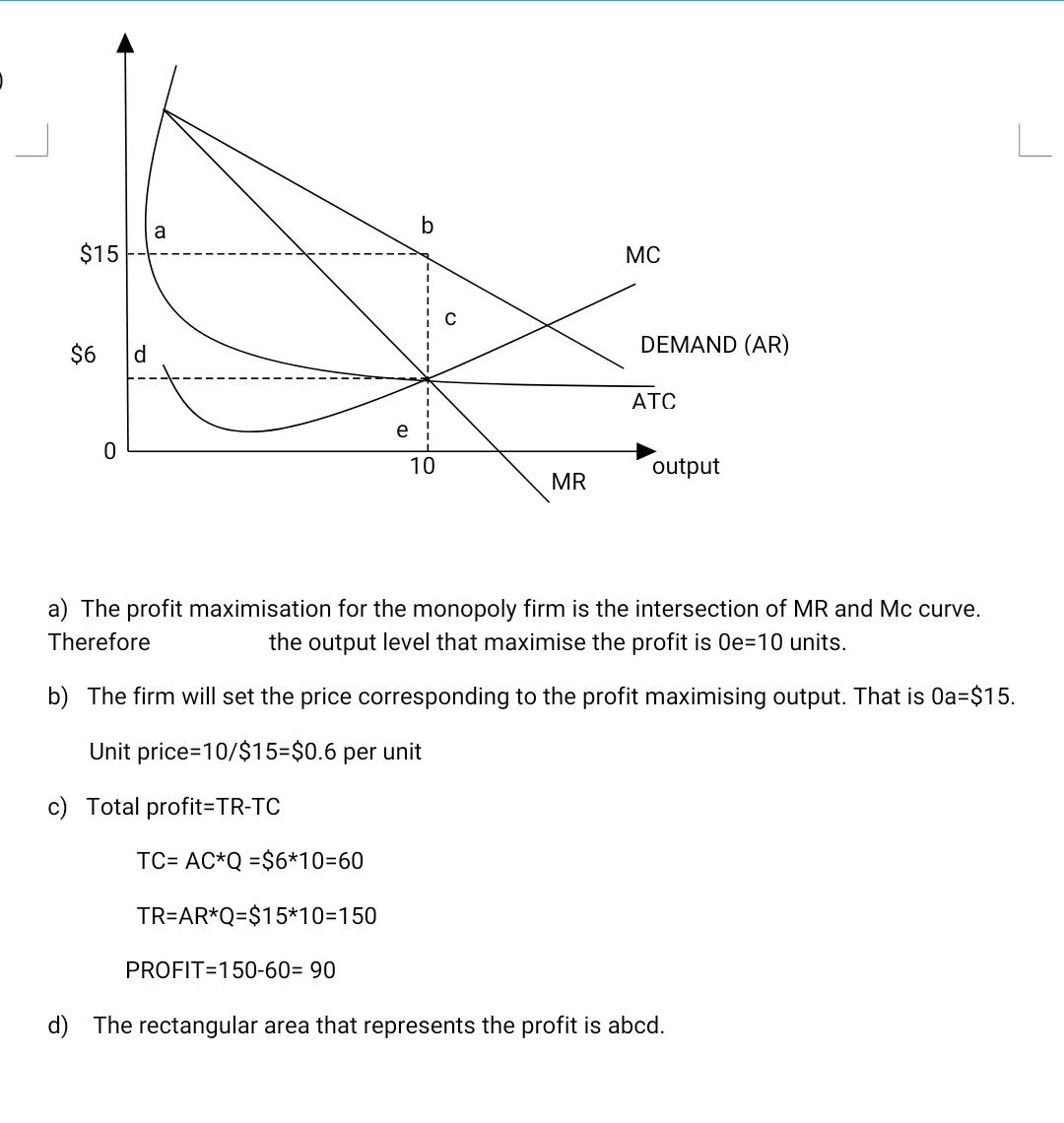 Use the diagram below which represents the demand, marginal revenue, marginal cost, and average total cost curves for a monopoly to answer the following questions: $30 $25 $20 $15 Demand MC $10 $5 ATC MR $0 8 10 12 14 ($5) Output a. Identify the output level which maximizes profits for this firm. Explain how you identified this output. b. Identify the unit price that this firm will set for its product in order to maximize profits. Explain how you identified this price level. c. Calculate the total profits of this firm at the output that maximizes profits. Show your work. d. Illustrate on the diagram the rectangular area which represents the firm's total profits from part a.