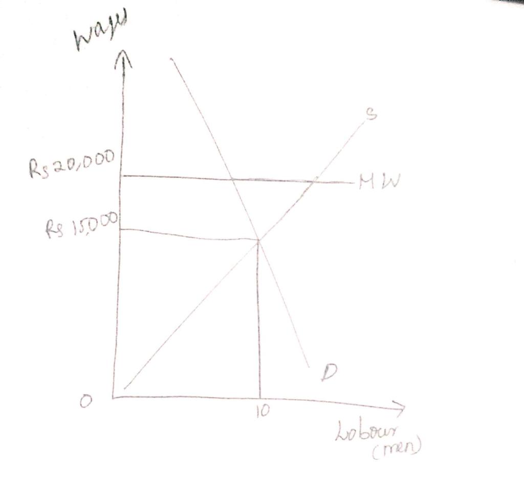 c. Before June 2020, the labor market in Pakistan was at equilibrium with an equilibrium wage (WE) of Rs. 15,000 and equilibrium quantity of labor (LE) 10 million. In the last week of June, 2020, government of Pakistan imposed a minimum wage Act raising the minimum wage to Rs. 20,000. Using a graph, explain the effect of imposition of minimum wage on unemployment in labor market of Pakistan (2 Marks).