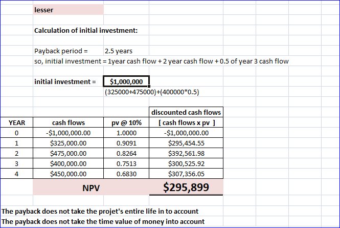 The NPV and payback period What information does the payback period provide? A project's payback period (PB) indicates the number of years required for a project to recover its initial investment using its operating cash flows. As the theoretical soundness of the conventional (undiscounted) PB technique was criticized, the model was modified to incorporate the time value of money-adjusted operating cash flows to create the discounted payback method. While both payback models continue to reflect faulty ranking criteria, they do provide important (useful information regarding a project's liquidity and riskiness. In general, the the payback, other things constant, the greater the project's liquidity. Suppose you are evaluating a project with the expected future cash inflows shown in the following table. Your boss has asked you to calculate the project's net present value (NPV). You don't know the project's initial cost, but you do know the project's regular, or conventional, payback period is 2.50 years. Year Cash Flow Year 1 $325,000 475,000 Year 2 Year 3 400,000 Year 4 450,000 If the project's weighted average cost of capital (WACC) is 10%, the project's NPV (rounded to the nearest dollar) is: $355,079 $281,104 $266,309 $295,899 Which of the following statements indicate a disadvantage of using the regular payback period (not the discounted payback period) for capital budgeting decisions? Check all that apply. The payback period does not take the project's entire life into account. The payback period is calculated using net income instead of cash flows. The payback period does not take the time value of money into account.