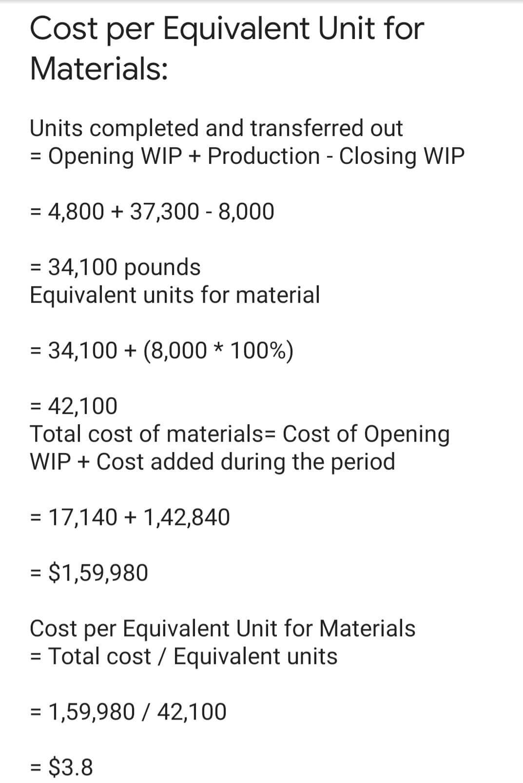 Clopack Company manufactures one product that goes through one processing department called Mixing. All raw materials are introduced at the start of work in the Mixing Department. The company uses the weighted average method to account for units and costs. Its Work in Process T-account for the Mixing Department for June follows (all forthcoming questions pertain to June): Work in Process-Mixing Department June 1-balance 30,000 Completed and transferred to Finished Goods ? Materials Direct labour Overhead 142,840 91,500 109,000 June 30-balance ? The June 1 work in process inventory consisted of 4,800 pounds with $17,140 in materials cost and $12,860 in conversion cost. The June 1 work in process inventory was 100% complete with respect to materials and 60% complete with respect to conversion. During June, 37,300 pounds were started into production. The June 30 work in process inventory consisted of 8,000 pounds that were 100% complete with respect to materials and 50% complete with respect to conversion. 8. What is the cost per equivalent unit for materials? (Round your answer to 2 decimal places.) Cost per equivalent unit for materials