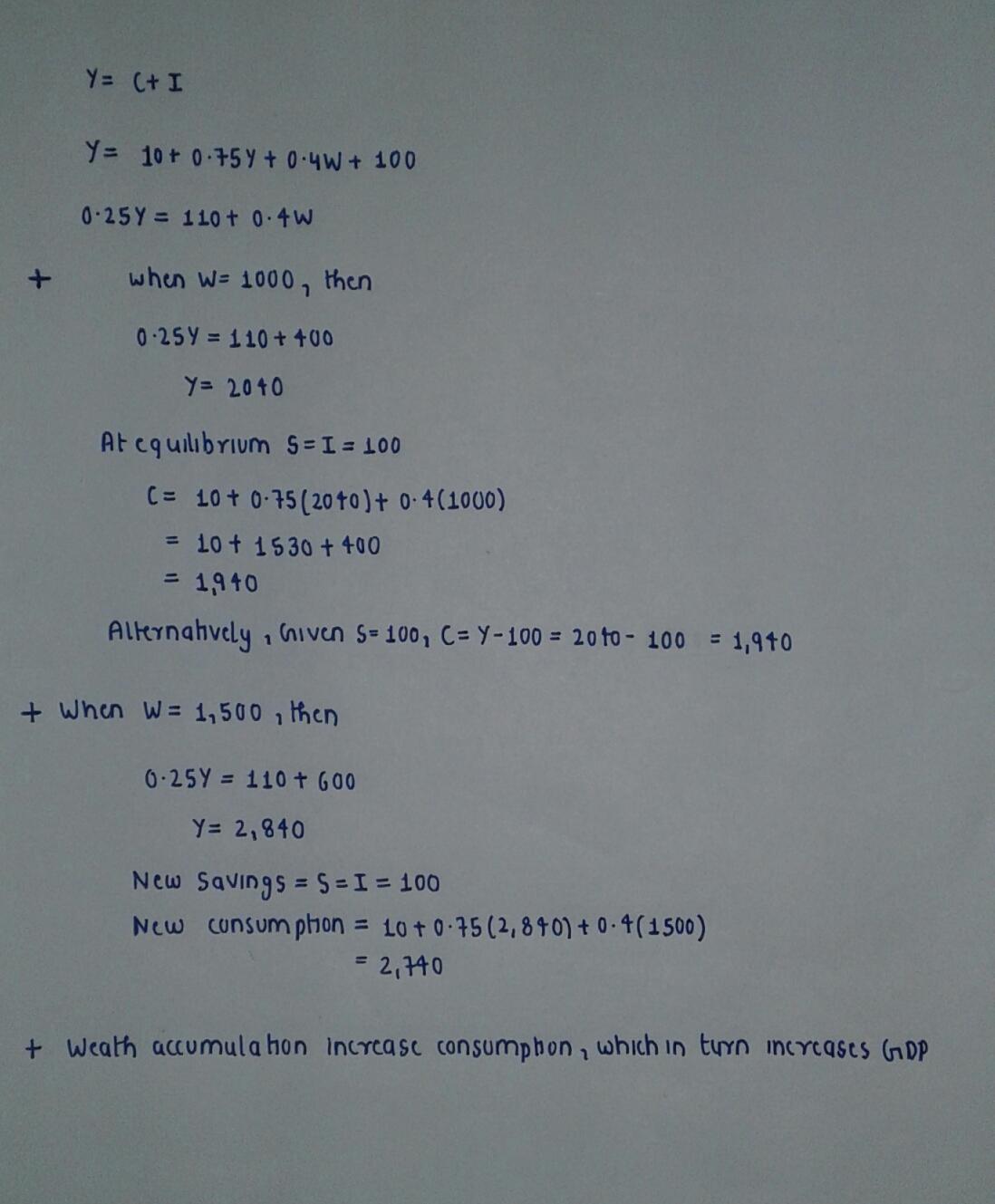 Consider the following model of a very simple economy: C= 10 + .75Y +.04W 1 = 100 W = 1000 Y = C +1 S = Y-C If you assume that wealth (W) and investment (1) remain constant, we are ignoring the fact that saving adds to the stock of wealth. What are the equilibrium levels of GDP (Y) consumption (C) and saving (S)? • Now suppose that wealth increases by 50% to 1500, recalculate the equilibrium levels of Y, C and S. • What impact does wealth accumulation have on GDP?