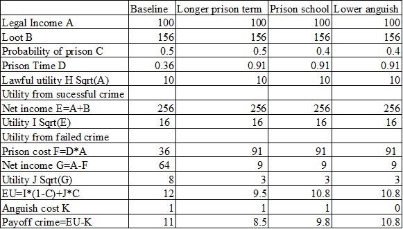 Does a More Severe Penalty Work? Using the data of Table 1 as a starting point, fill out the numbers to make the loot $156 and the anguish cost from crime 1 util. The probability of successful crime is 0.5 and the probability of prison is 0.5. Baseline Longer prison term Prison School Lower anguish 100 100 100 100 Legal income (S) 156 156 156 156 Loot ($) 0.5 0.5 0.4 0.4 Probability of prison 0.36 0.91 0.91 0.91 Prison time