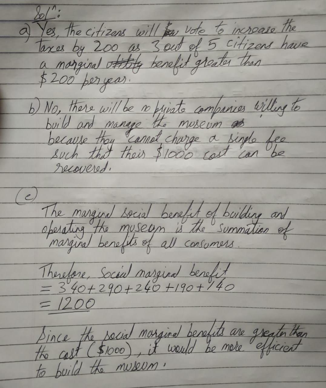 The town of Smallville is considering building a museum. The city will have to borrow money to build the museum and will own $1000 per year in interest. Each citizen's marginal benefit is listed in the table below. Citizen Rarginal benefit from museum (S/year) Anita 340 Brandon 290 Carlena 240 Dallas 190 Eloise 140 Assuming each citizen voted based on their own private interests, would they vote to increase taxes by $200 per person per year to build the museum? b If instead a private company built the museum and charged people a yearly fee to attend the museum, would any company offer to build it? Explain Comparing the cost to the social marginal benefit would it be more efficient to build the museum or not?