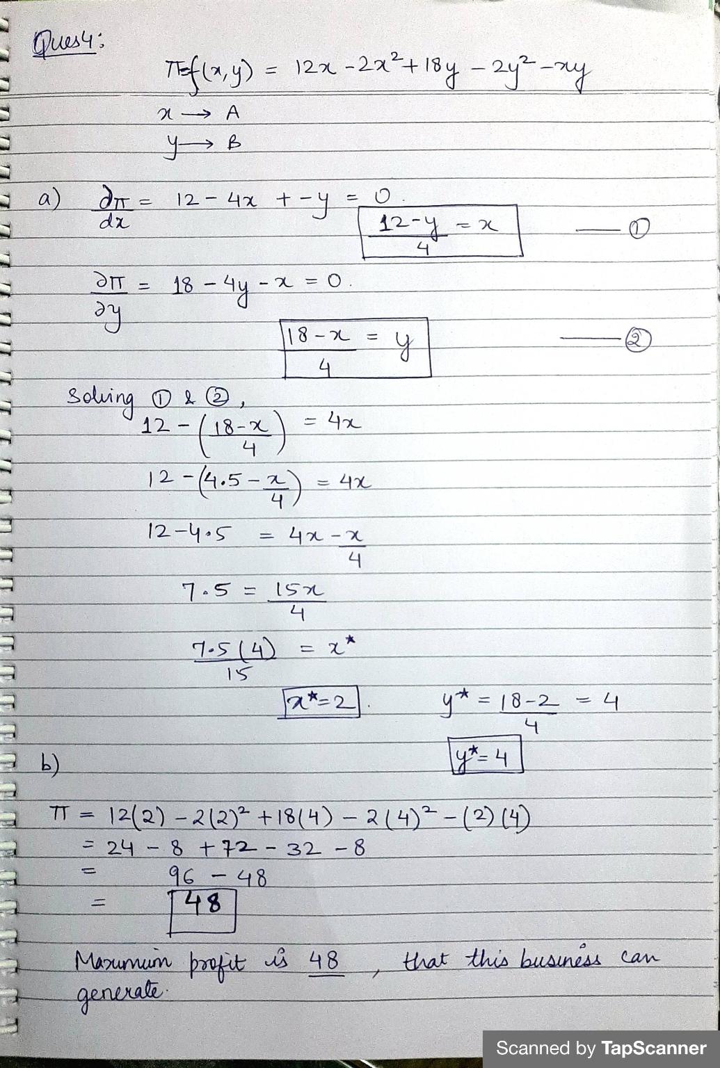 The profit function of a business firm producing only two products (A and B) are as follows: a = f(x,y) = 12x – 2x² + 18y – 2y2 – xy Here, x represents amount of product A and y represents amount of product B