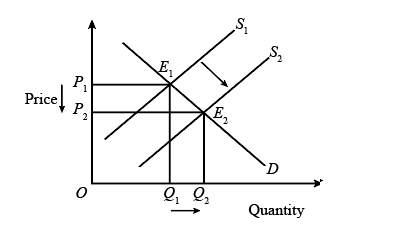 The total production of Integrated circuits is more and the supply shifts from S1 to S2 due to an increase in production after every period of two years. There is more supply of Integrated circuits which leads to a reduction in prices of each unit of ICs.