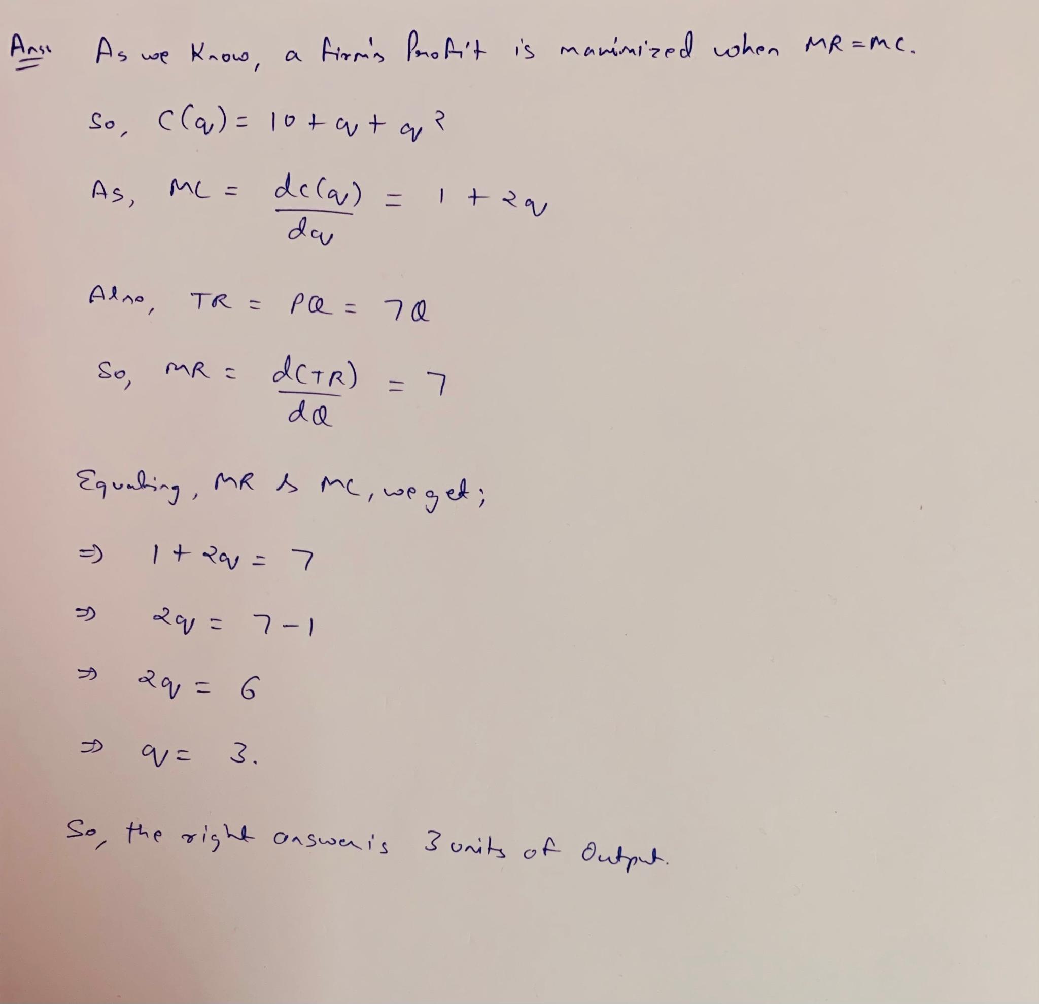 Assume a firm's short-run cost function is given by the following expression: C(q) = 10+q+q? If the firm can sell each unit of their output at a price of p = 7