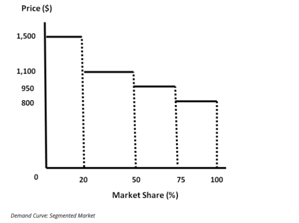 When the product price is $1,500, the firm can sell, at that price, to a maximum of 20 percent of the market. Any price drop below that is irrelevant unless the price decreases to at least $1,100, which is the reference price for the next market segment.