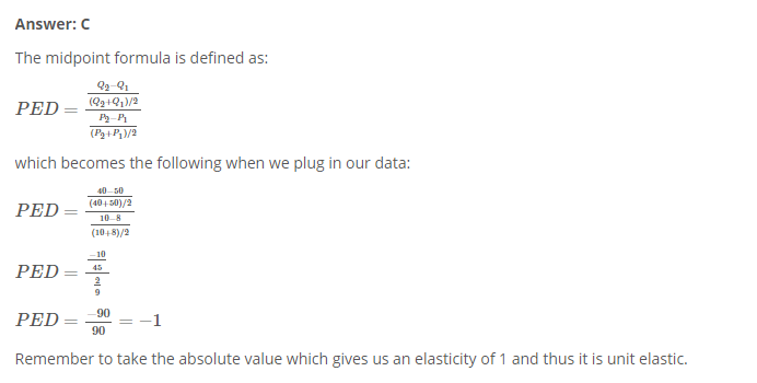 Suppose Sally O'Neal's pizza restaurant raises the price of a large cheese pizza from $8 to $10. As a result, the quantity demanded of pizzas decreases from 50 to 40. Using the midpoint method, the price elasticity of demand for cheese pizza is