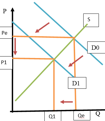 The statement by the surgeon general on the adverse effects of donuts on the health of individual will change the tastes and preferences of people against donuts. As a result, the demand for donuts will decline. On graph below, this circumstance is illustrated by the change in demand curve from D0 to D1. This shift causes the quantity of donuts demanded to drop from Qe to Q1 and the price to decline from Pe to P1.