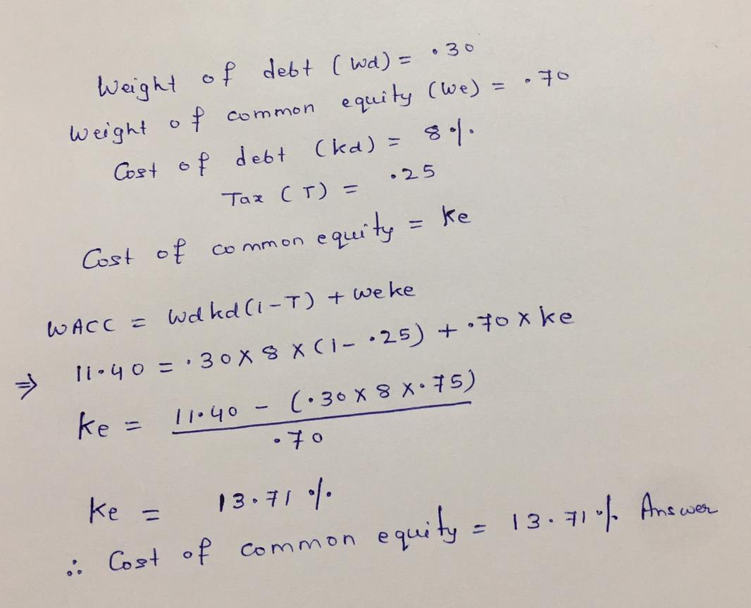 Pearson Motors has a target capital structure of 30% debt and 70% common equity, with no preferred stock. The yield to maturity on the company's outstanding bonds is 8%, and its tax rate is 25%. Pearson's CFO estimates that the company's WACC is 11.40%. What is Pearson's cost of common equity? Do not round intermediate calculations. Round your answer to two decimal places.