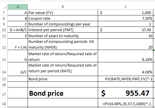 Wine and Roses, Inc., offers a bond with a coupon of 7.5 percent with semiannual payments and a yield to maturity of 8.16 percent. The bonds mature in 10 years. What is the market price of a $1,000 face value bond? O $1.449.42 O $1,055 32 O $1.506.05 O $1,461.51 $955.47