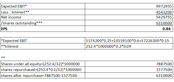 Daddi Mac, Inc, doesn't face any taxes and has $252.40 million in assets, currently financed entirely with equity. Equity is worth $32 per share, and book value of equity is equal to market value of equity. Also, let's assume that the firm's expected values for EBIT depend upon which state of the economy occurs this year, with the possible values of EBIT and their associated probabilities as shown below: State Recession Average Boom Probability of state 0.25 0.60 8.15 Expected EBIT in $5,174,200 $10,159,100 $17,226,308 state The firm is considering switching to a 20-percent-debt capital structure and has determined that it would have to pay a 9 percent yield on perpetual debt in either event. What will be the level of expected EPS if the firm switches to the proposed capital structure? (Do not round intermediate calculations and round your final answer to 2 decimal places.) Expected EPS