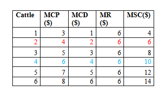 Farmer Fern can choose either to farm or not to farm. Her cost of production is $10, and her revenue is $12 when there are no cattle roaming loose. For each additional cow her revenue is reduced by the amount in the MCD column below.