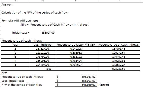 Find the net present value (NPV) for the following series of future cash flows, assuming the company's cost of capital is 6.36 percent. The initial outlay is $353,007. Year 1: 167,827 Year 2: 121,010 Year 3: 173,792 Year 4: 186,906 Year 5: 194,407 Round the answer to two decimal places.