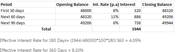 A firm had a Floating rate loan from a bank to be paid at maturity with the following data: Loan amount = $48,000 Time to Maturity = 180 days, year has 360 days. Interest rate = Prime Rate + 1.5% increment (risk premium). The prime rate is expected to have the following values over the 180 days: the prime rate is currently 6.5% and will remain so for the first 30 days. the prime rate will increase by 3% in the next 60 days. the prime rate will be 4.5% in the final 90 days. Using the expected prime rate values, answer the following questions. The interest amount for the first 30 days The interest amount for the next 60 days The interest amount for the final 90 days The total interest amount for 180 days floating rate loan Effective Interest rate for 180 days of floating rate loan ( -- Ettective Annual Interest rate of the floating rate loan (2