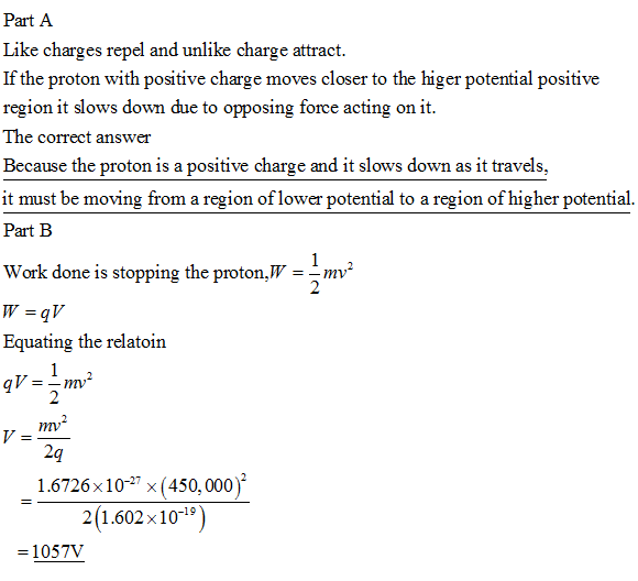 Because the proton is a positive charge and it slows down as it travels, it must be moving from a region of lower potential to a region of higher potential.