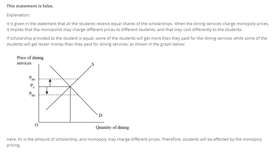At Southwestern University all of the students eat in the same dining halls. At Southwestern University, all of the profits from dining services are used to fund scholarships for the students. You may assume that all students are identical, having the same demand for dining services and all students receive equal shares of the scholarships. True or False: Students won't care if the dining services charge monopoly prices because all of the profits from dining services are returned to students in the form of scholarships at Southwestern University. Explain your answer using a diagram.