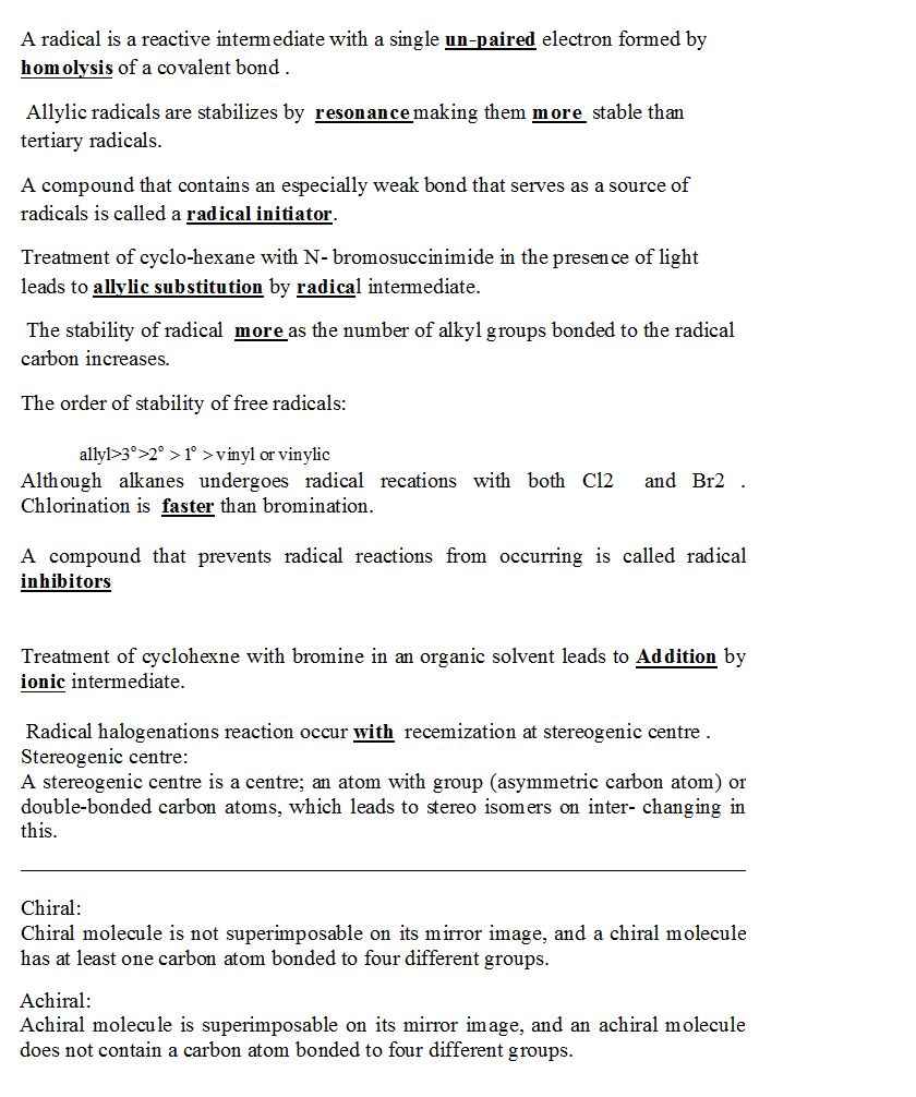 Select the keyword or phrase that will best complete each sentence. A radical is a reactive intermediate with a single ___ electron, formed by ___ of a covalent bond. Allylic radicals are stabilized by_____, making them ___ stable than tertiary radicals. A compound that contains an especially weak bond that serves as a source of radicals is called a radical ____. Treatment of cyclohexene with N-bromosuccinimide in the presence of light leads to___ by ___ intermediates. The stability of a radical ____ as the number of alkyl groups bonded to the radical carbon increases. Although alkanes undergo radical substitution reactions with both Cl_2 and Br_2 chlorination is ___ than bromination. A compound that prevents radical reactions from occurring is called a radical ___ Treatment of cyclohexene with bromine in an organic solvent leads to ___ by ___ intermediates. Radical halogenation reactions occur ____ racemization at a stereogenic center.