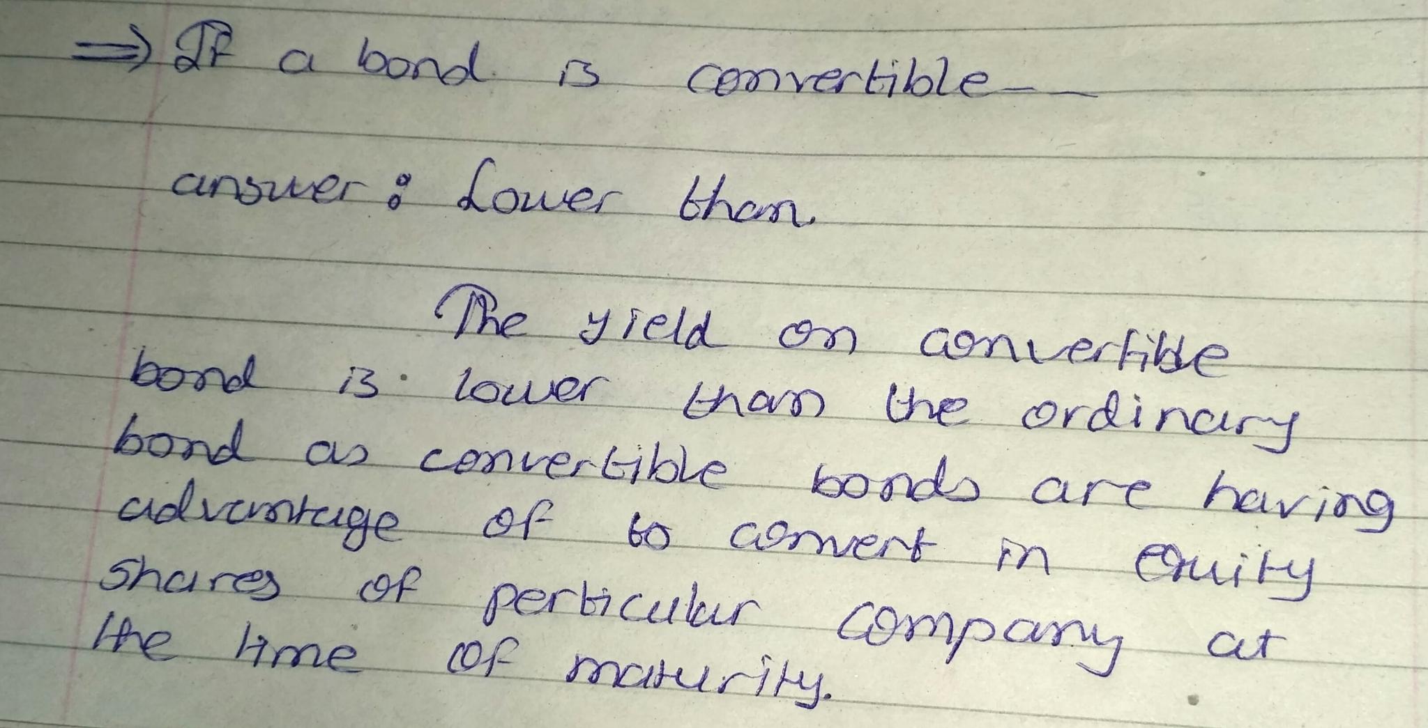 If a bond is convertible, its interest rate (yield) should be the rate on an ordinary bond of the same issuer and maturity: higher than 2 lower than the same as
