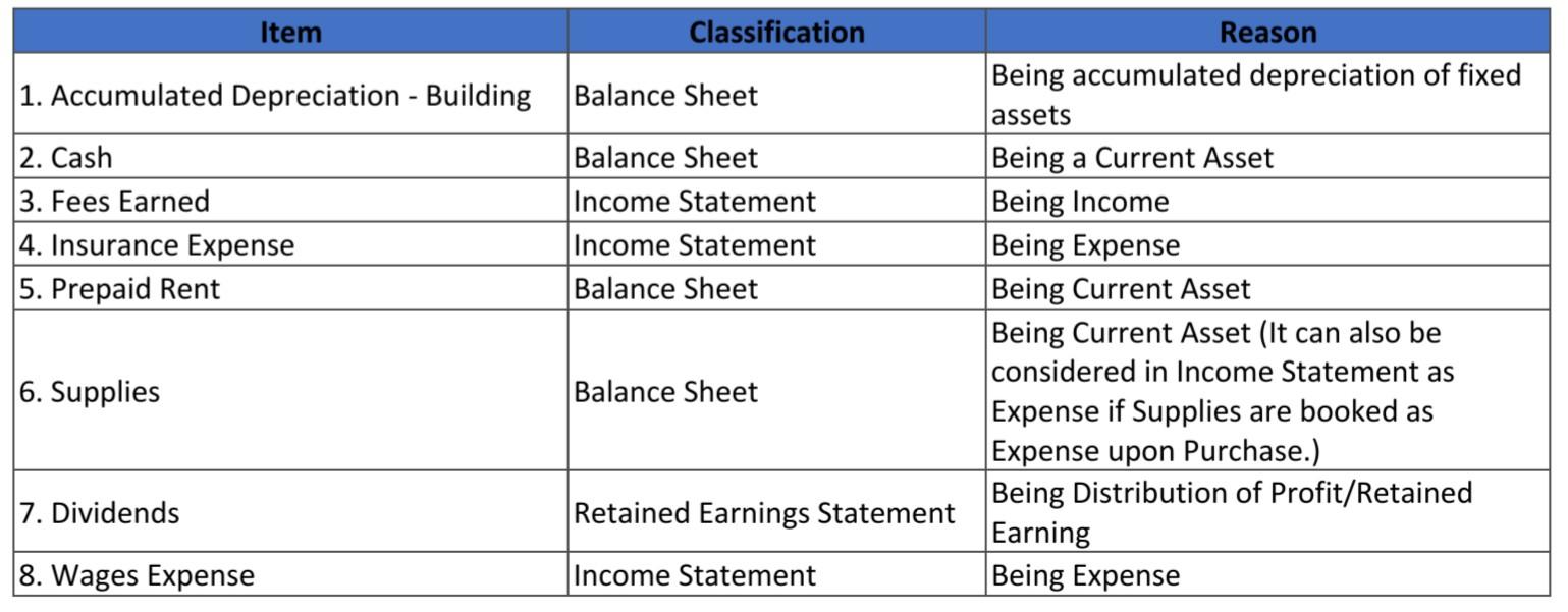 Flow of Accounts into Financial Statements The balances for the accounts that follow appear in the Adjusted Trial Balance columns of the end-of-period spreadsheet. Indicate whether each account would flow into the income statement, retained earnings statement, or balance sheet. 1. Accumulated Depreciation-Building 2. Cash 3. Fees Earned 4. Insurance Expense 5. Prepaid Rent 6. Supplies 7. Dividends 8. Wages Expense