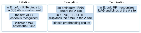 Determine whether the following events occur during initiation, elongation, or termination. Initiation Elongation Termination In E. coli, RF1 recognizes in E. coli, EF-G-GTP an aminoacyl-tRNA UAG and binds at the A site displaces the tRNA in the A site enters the A site in E. coli, mRNA binds to kinetic proofreading occurs the first AUG initiator tRNA the 30S ribosomal subunit codon is recognized enters the P site