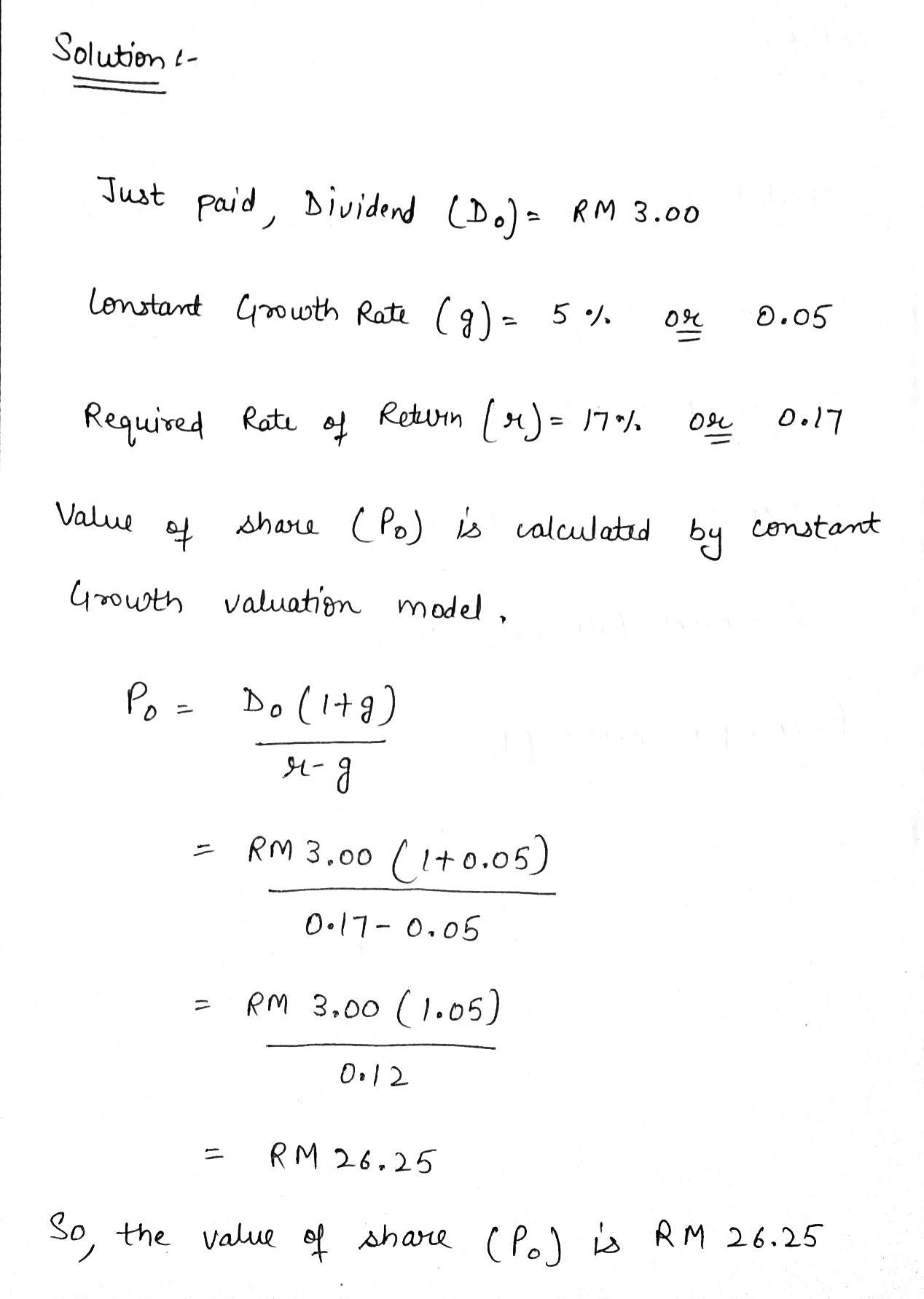AZIZAH Berhad paid a dividend of RM3.00 on its ordinary share yesterday. The company's dividends are expected to grow at a constant rate of 5% indefinitely. The required rate of return on this share is 17%. You observe a market price of RM27.50 for the share. What is the value of the share?