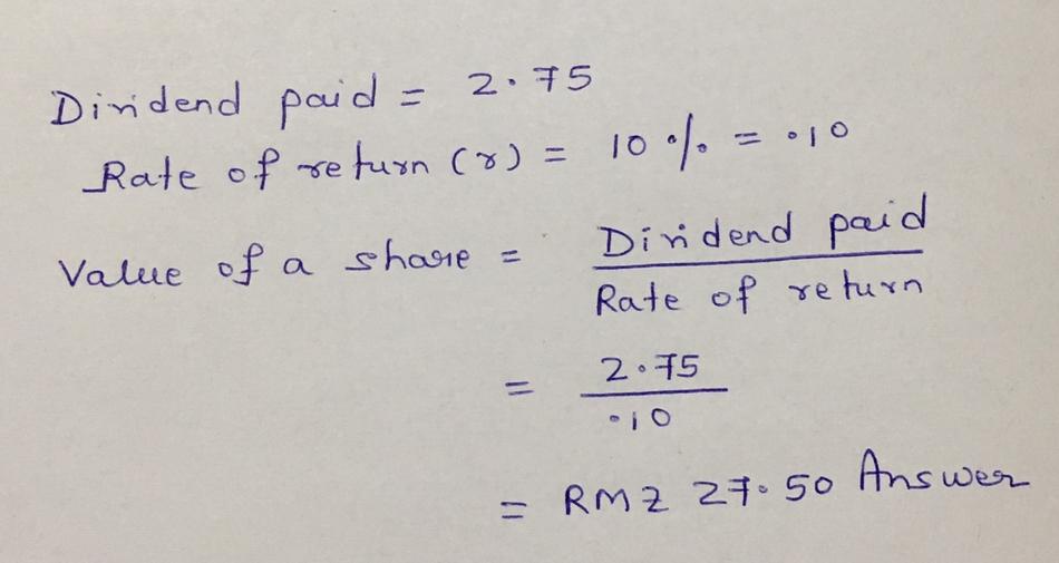Padma invests in a share of Walls Berhad which expects no growth in dividends. The company paid a RM2.75 dividend per share. If Padma requires a rate of return of 10%, calculate the value of the share.