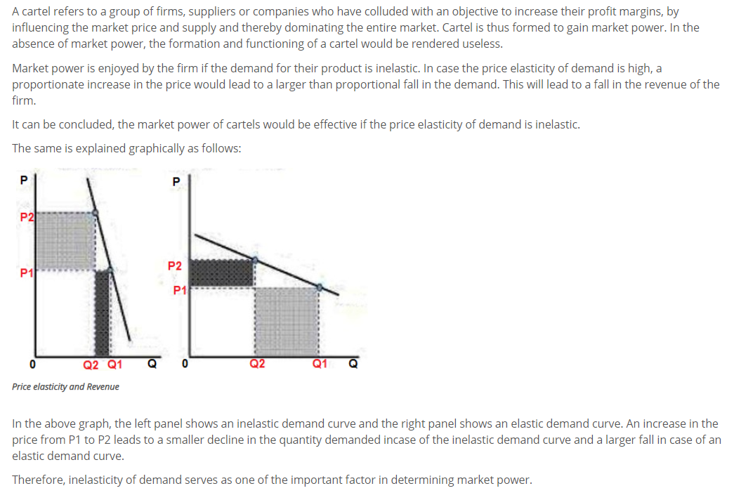 Why would an increase in the market elasticity of demand reduce a cartel's market power? Illustrate with a graph