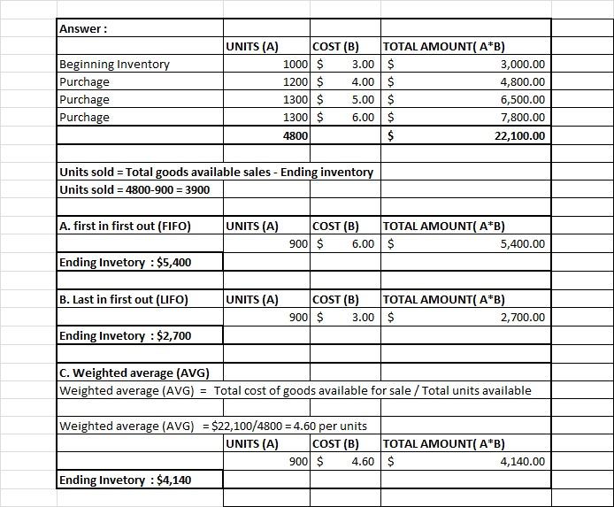 Trini Company had the following transactions for the month. Number of Units Cost per Unit Beginning Inventory 1000 $3 Purchased May 31 1200 $4 Purchased July 15 1300 $5 Purchased Nov. 1 1300 $6 Totals (goods available) 4800 Ending Inventory 900 Calculate the ending inventory dollar value for each of the following cost allocation methods, using periodic inventory updating. Provide your calculations. A. first-in, first-out (FIFO) B. last-in, first-out (LIFO) C. weighted average (AVG)