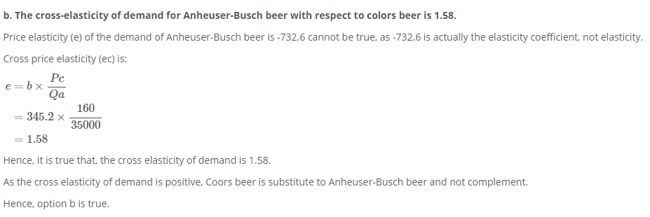 b. The cross-elasticity of demand for Anheuser-Busch beer with respect to colors beer is 1.58.