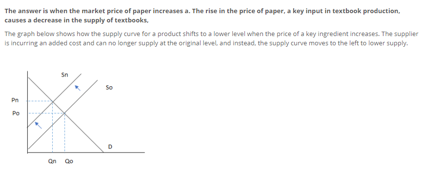 b. The rise in the price of paper, a key input in textbook production, causes an increase in the supply of textbooks,