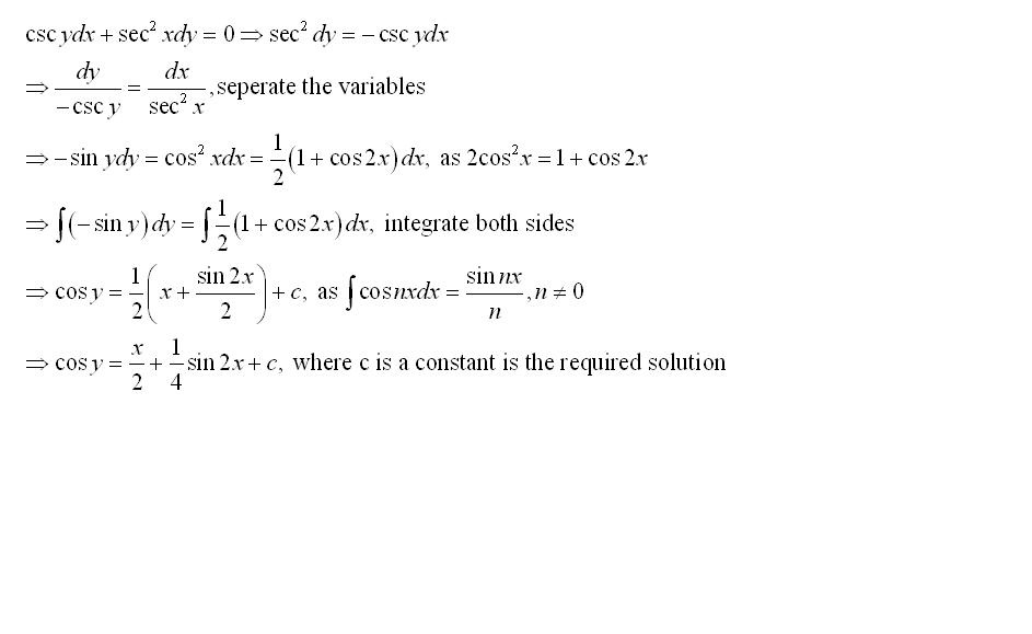 Solve the given differential equation by separation of variables. csc y dx + sec^2x dy =0