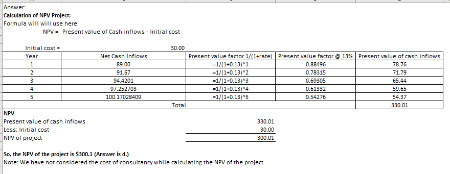 Assume the following investment opportunity with a discount rate of 13%. Investment takes place today, that is at year 0, and equals 30. The firm has hired a group of consultants which prepared the projections in the table below. The costs of their services are 85 and this will be paid next year.
