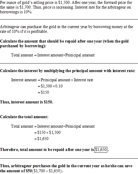 The price of gold is currently $1,500 per ounce. The forward price for delivery in one year is $1,700. An arbitrageur can borrow money at 10% per annum. What should the arbitrageur do? Assume that the cost of storing gold is zero and that gold provides no income.