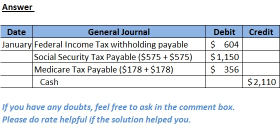 Answer Date General Journal Debit Credit January Federal Income Tax withholding payable $ 604 Social Security Tax Payable ($575 + $575) $ 1,150 Medicare Tax Payable ($178 +$178) S 356 Cash $2,110 If you have any doubts, feel free to ask in the comment box. Please do rate helpful if the solution helped you.